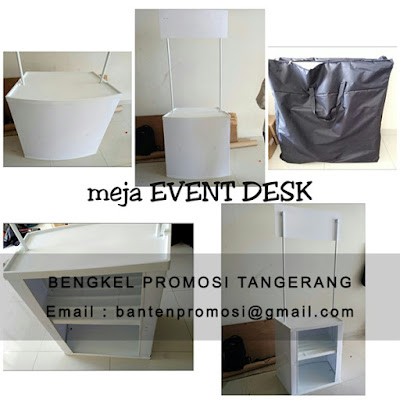 Event Desk, booth portable atau meja promosi adalah display yang terbuat dari PVC plastik yang sering kita jumpai di Mall, Car Free Day atau tempat lainnya. Event desk biasanya media yang tepat digunakan karena sifatnya yang portable dan praktis membuat event desk dapat digunakan berulang